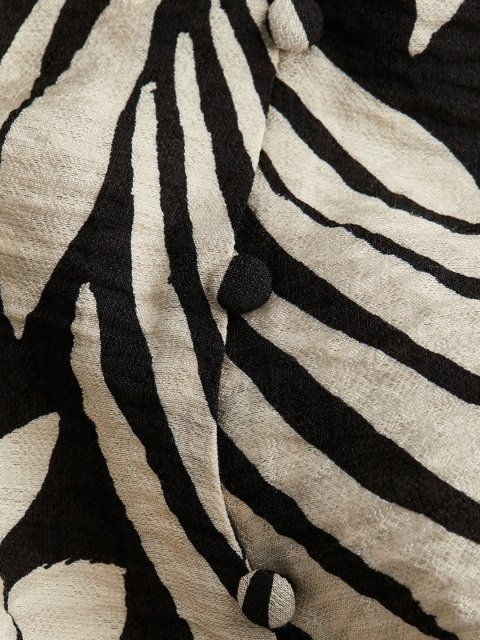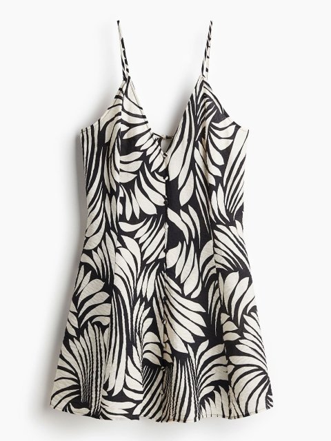 Short, A-line dress in an airy weave with a deep V-neckline and covered buttons down the front. Narrow, adjustable shoulder straps and horizontal ties at the back. Unlined.