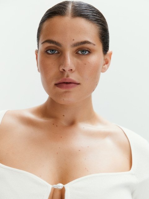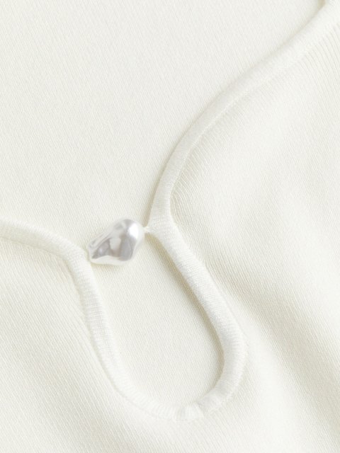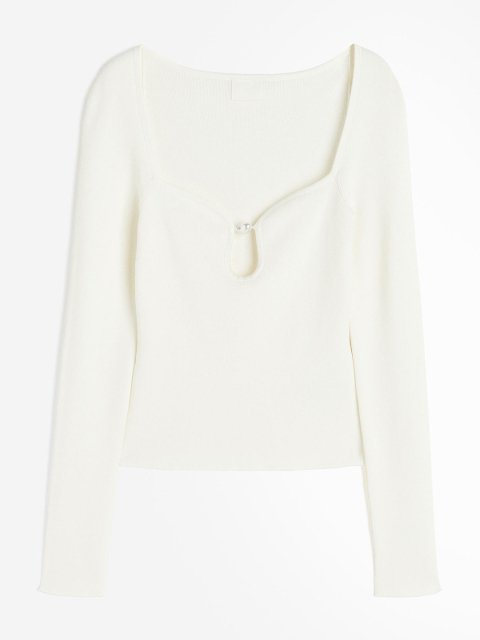 Long-sleeved, fitted top in a soft rib knit with a sweetheart neckline and a keyhole opening with a pearly plastic bead at the centre of the bust.