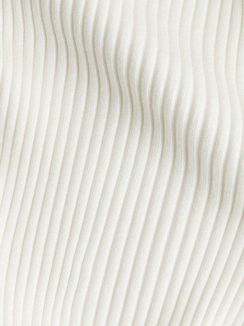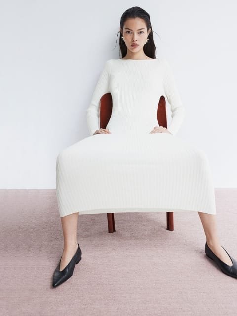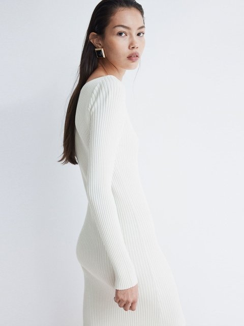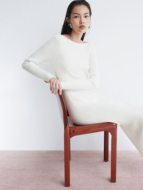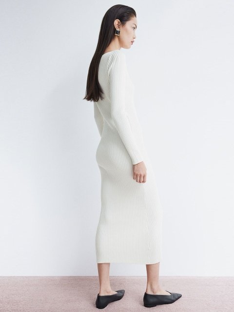 Calf-length, fitted dress in a soft rib knit with a boat neckline and long sleeves.