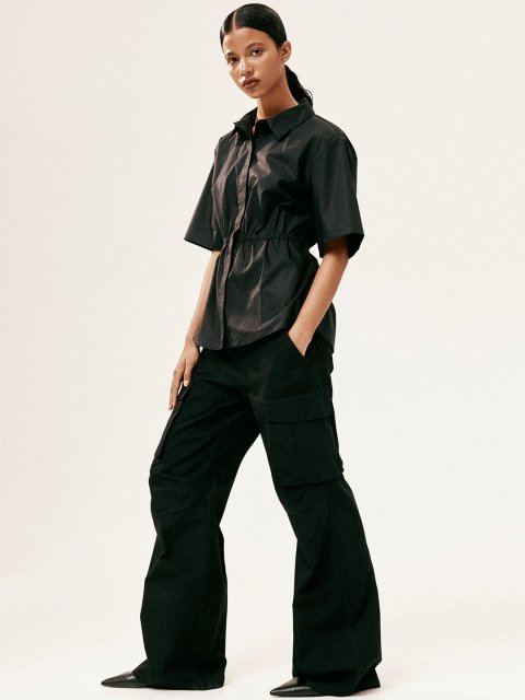 Trousers in cotton canvas featuring a low waist with covered elastication at the back and a zip fly and press-stud. Diagonal side pockets and wide legs that have bellows pockets with a flap.