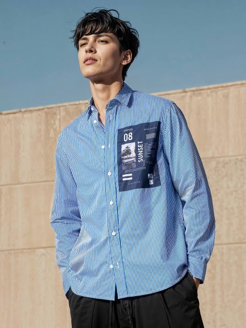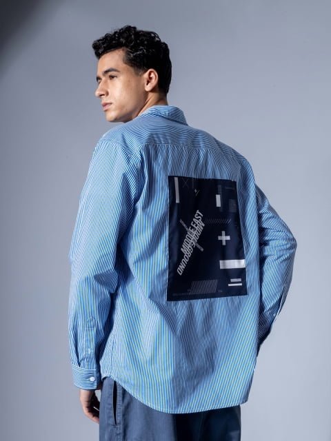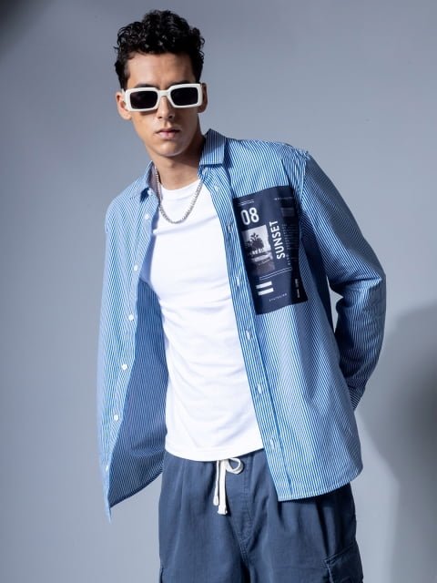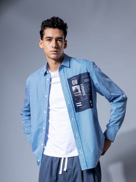 Elevate you style with cool and trendy striped full sleeve shirt features typography print, turn-down collar with buttoned cuffs and curved hemline for a stylish look