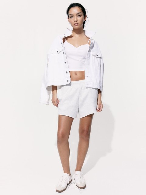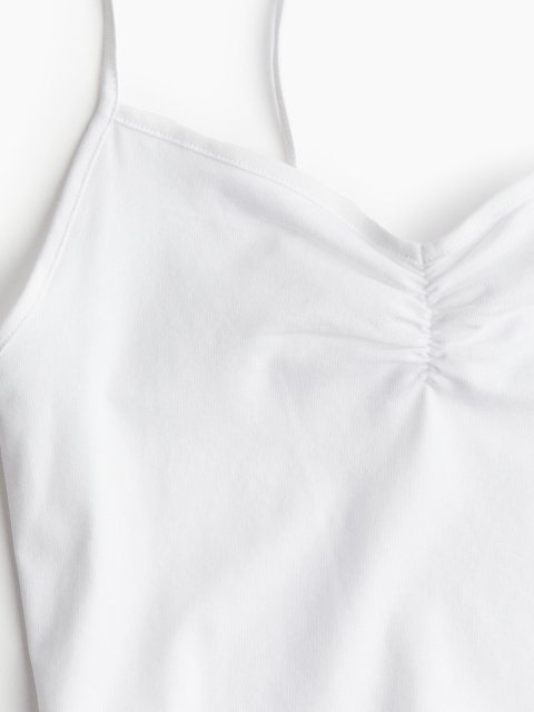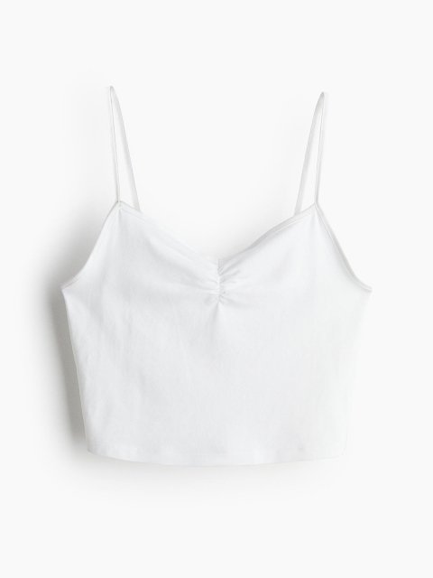 Cropped, fitted top in soft jersey with a V-shaped neckline, narrow shoulder straps and a gathered seam at the centre of the bust.