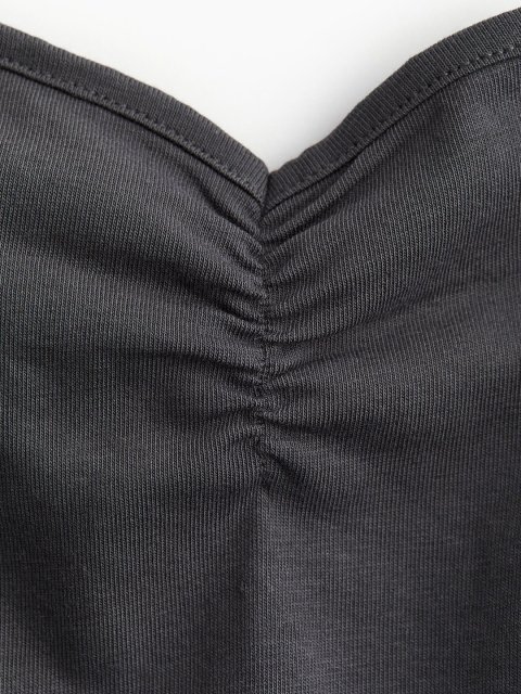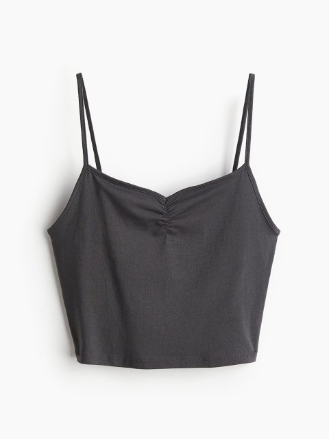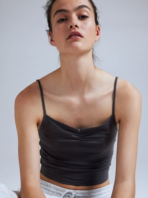 Cropped, fitted top in soft jersey with a V-shaped neckline, narrow shoulder straps and a gathered seam at the centre of the bust.