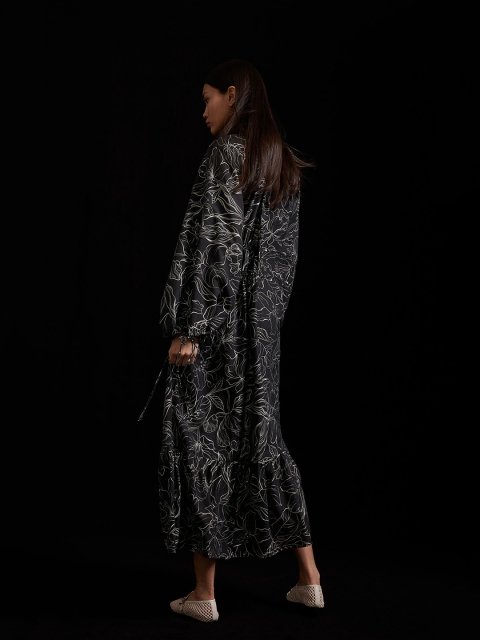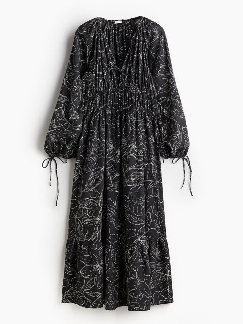 Long, oversized dress in woven fabric featuring a deep V-neckline with spaghetti ties at the front, long balloon sleeves and a gathered seam at the hem for added width. Delicate spaghetti drawstrings at the neckline, waist and cuffs. Unlined.