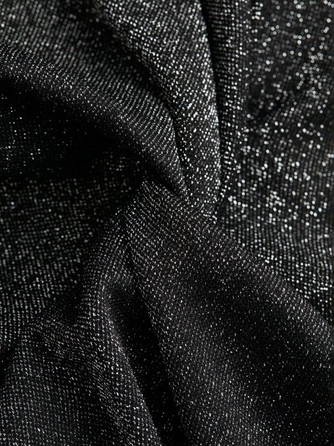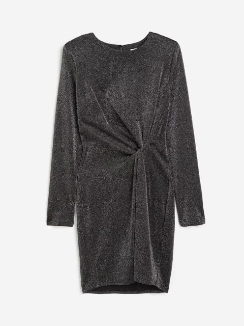Thin shoulder pads, long sleeves and a knot detail at one side of the waist for a gently draped effect.