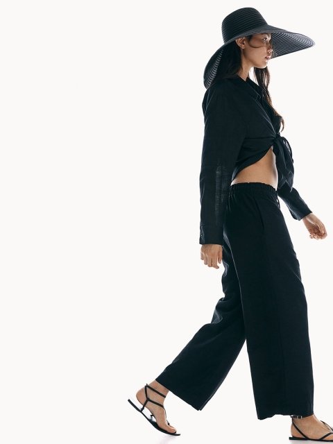 Loose-fit trousers in an airy weave made from a linen blend. High waist with smocked elastication, a narrow drawstring and a small frill trim. Discreet side pockets and wide, ankle-length legs.