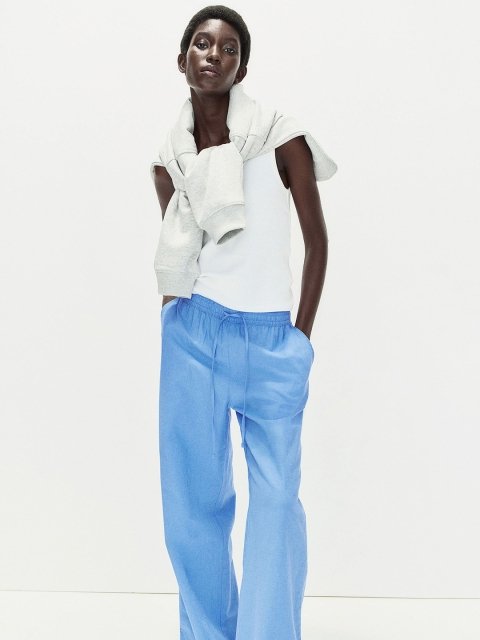 Loose-fit trousers in an airy weave made from a linen blend. Elasticated, drawstring waist, diagonal side pockets and straight legs.