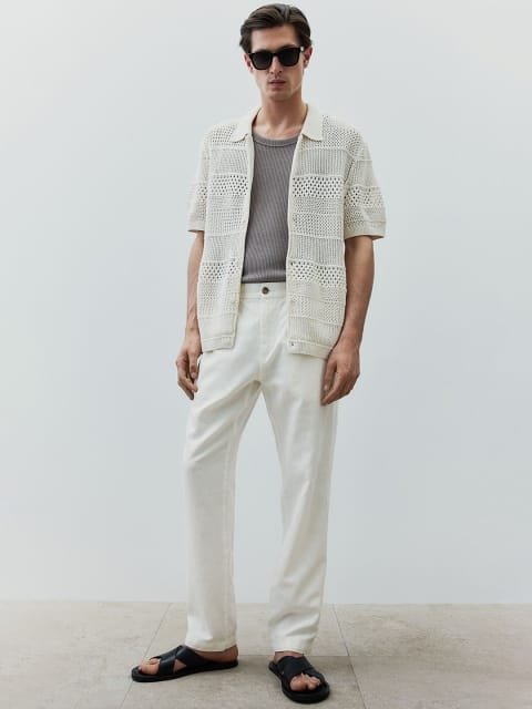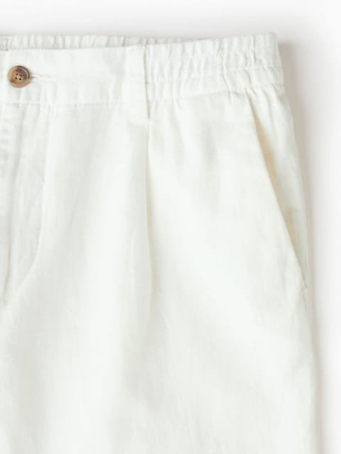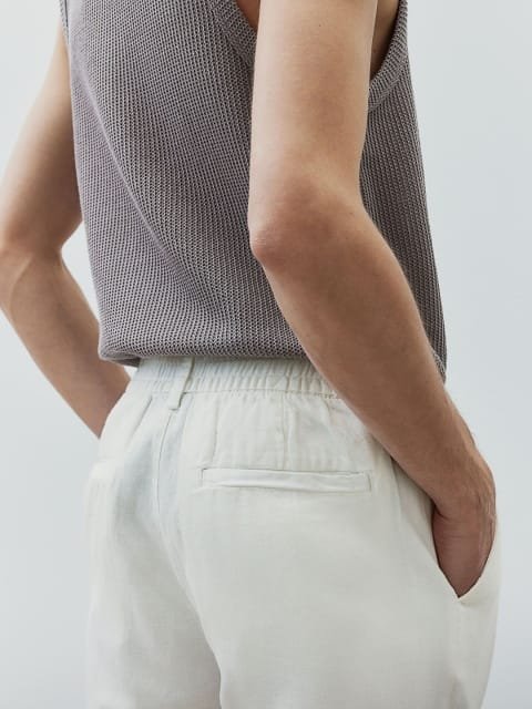 Trousers in an airy cotton and linen weave with covered elastication at the waist and a zip fly and button. Pleats at the top, side pockets and welt back pockets. Regular fit for comfortable wear and a classic silhouette. Cotton and linen blends combine the softness of cotton with the sturdiness of linen, creating a beautiful, textured fabric that is breathable and drapes perfectly.