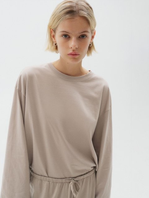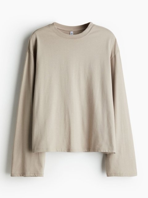 Boxy-style top in soft cotton jersey with a round, rib-trimmed neckline. Loose fit with dropped shoulders and long sleeves.