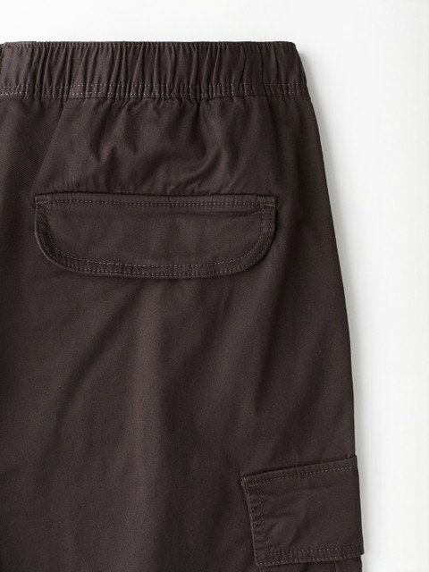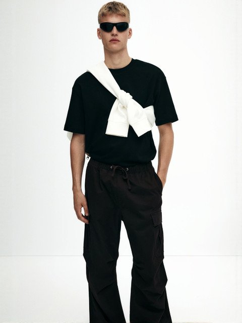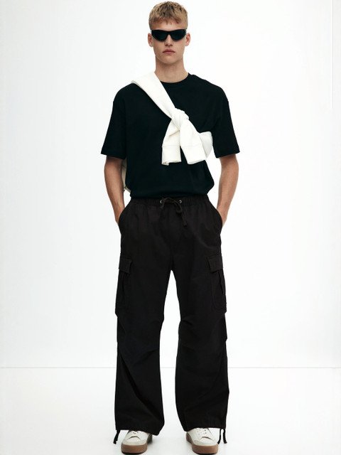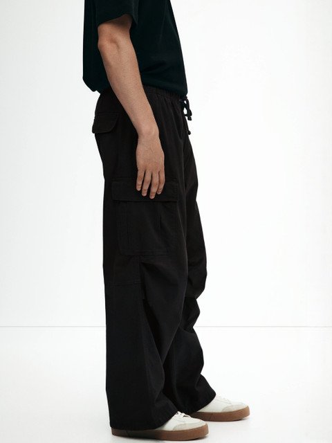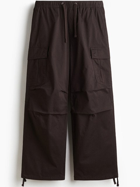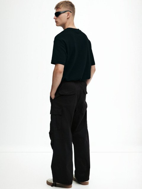 Cargo trousers in a cotton weave with covered elastication and a drawstring at the waist, a fake fly, diagonal side pockets, flap back pockets with a press-stud and flap leg pockets with press-studs. Sewn-in pleats at the knees and a concealed drawstring at the hems. Loose fit for a generous but not oversized silhouette.