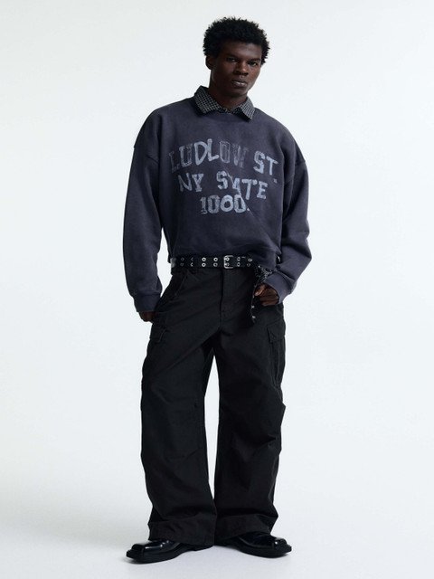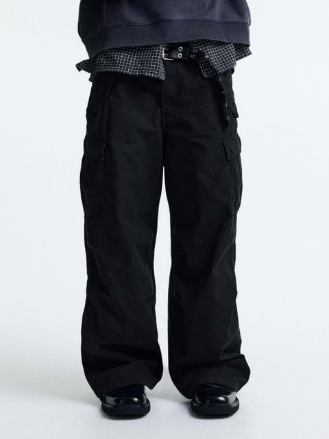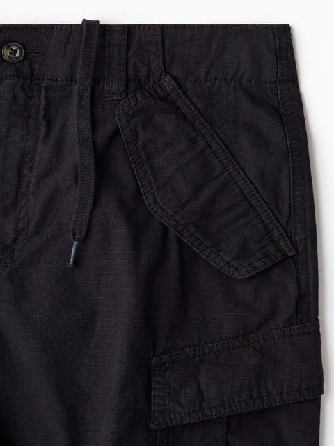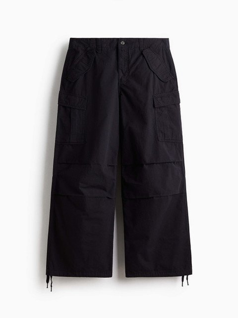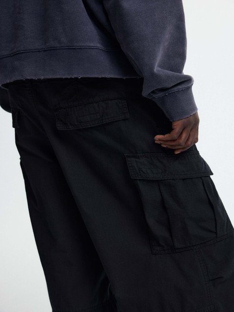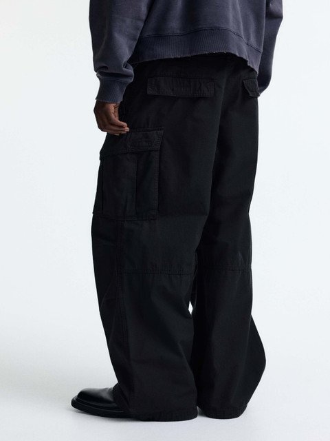 Cargo trousers in woven fabric with a zip fly and button and an internal drawstring at the waist. Flap side pockets, flap back pockets with a hook and loop fastening and flap leg pockets. Sewn-in pleats at the knees and a concealed drawstring at the hems. Loose fit for a generous but not oversized silhouette.