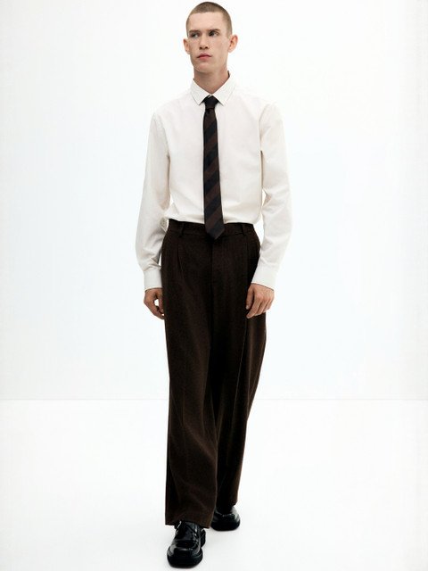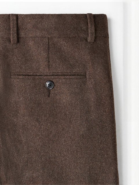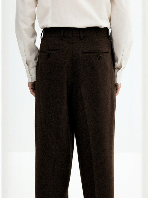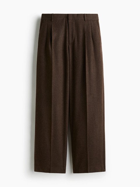 Tailored trousers in a soft weave made from a wool blend with a zip fly and a waistband with a concealed button and hook-and-bar fastener. Diagonal side pockets, jetted back pockets and wide legs with creases. Loose fit for a generous but not oversized silhouette.