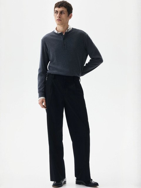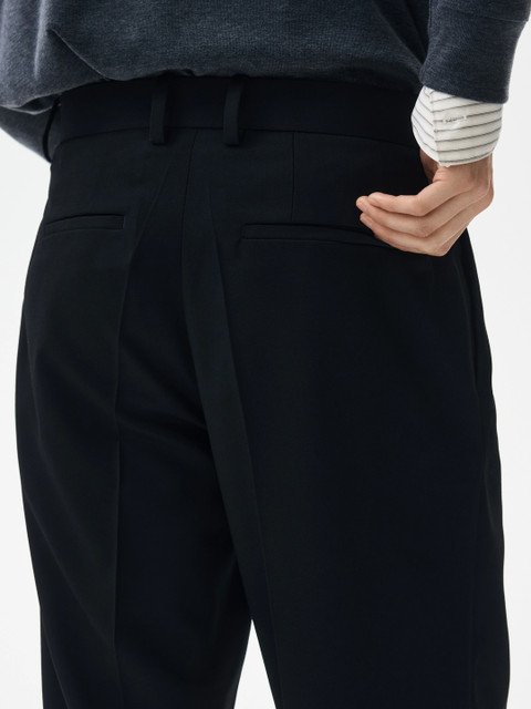 Tailored trousers in a soft weave with pleats at the top, a zip fly and a waistband with a concealed button and hook-and-bar fastener. Diagonal side pockets, welt back pockets and wide legs with creases. Loose fit for a generous but not oversized silhouette.