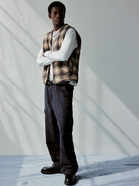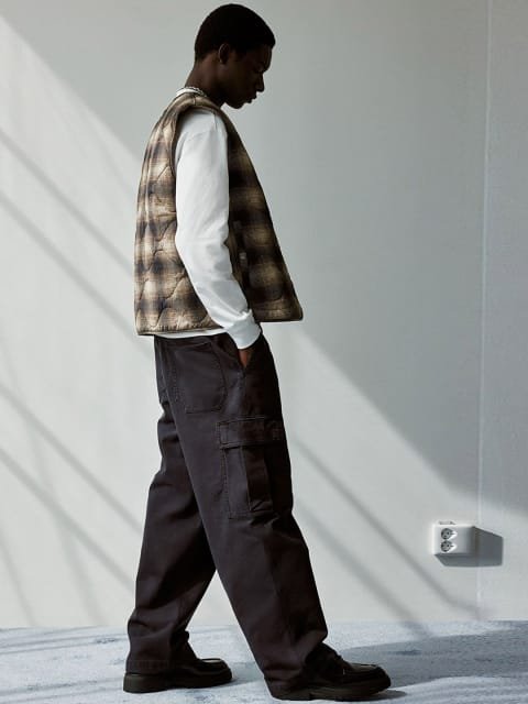 Cargo trousers in sturdy cotton canvas with a zip fly and button, side pockets, back pockets and bellows leg pockets with a flap and press-studs. Baggy fit for a casual but not oversized silhouette.