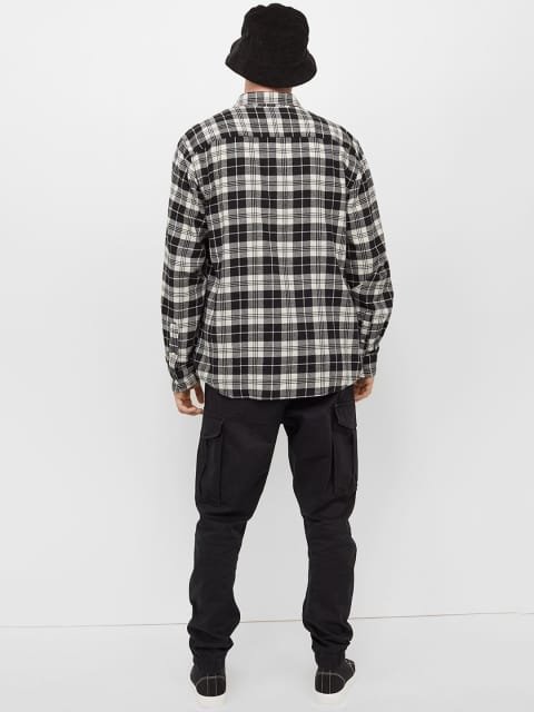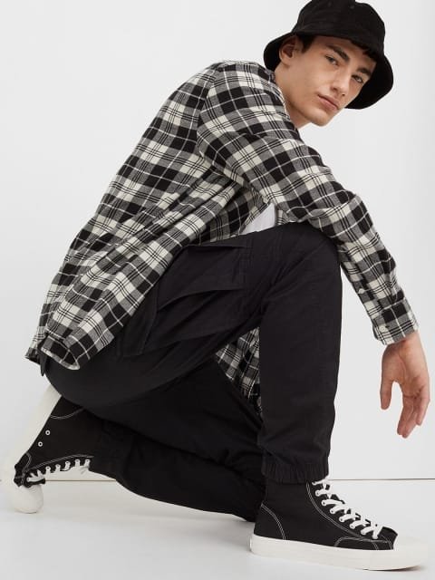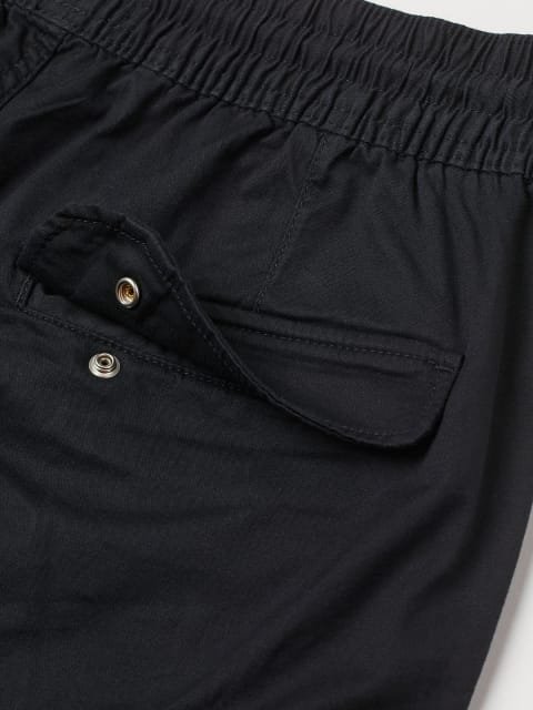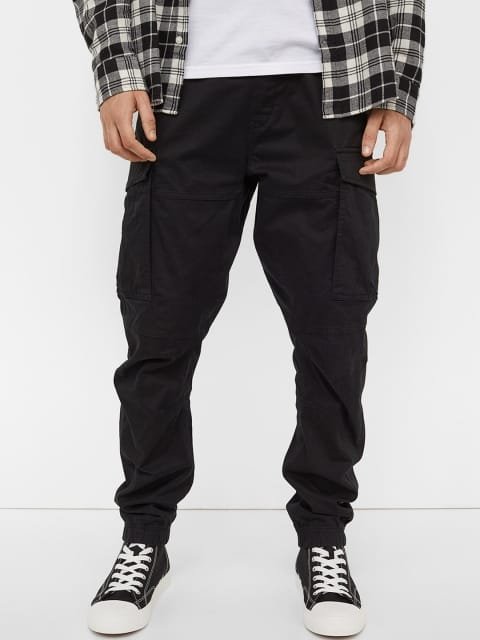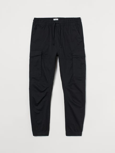 Joggers in a cotton weave with covered elastication and a drawstring at the waist, diagonal side pockets and flap back and leg pockets with concealed press-studs. Tapered legs with seams and darts at the knees and covered elastication at the hems.