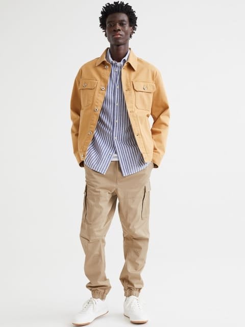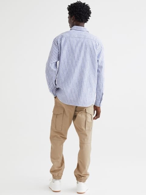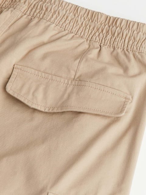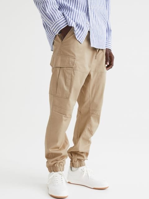 Joggers in a cotton weave with covered elastication and a drawstring at the waist, diagonal side pockets and flap back and leg pockets with concealed press-studs. Tapered legs with seams and darts at the knees and covered elastication at the hems.