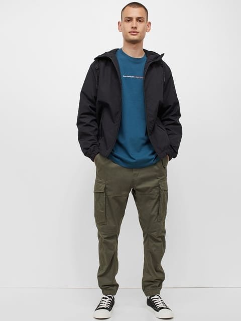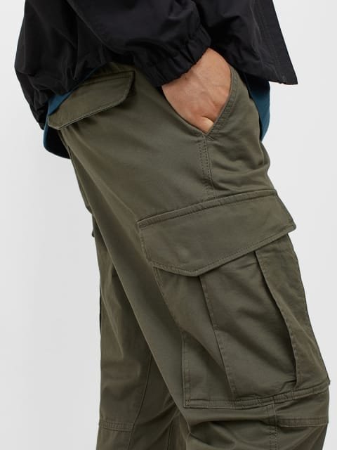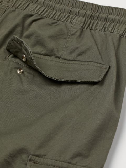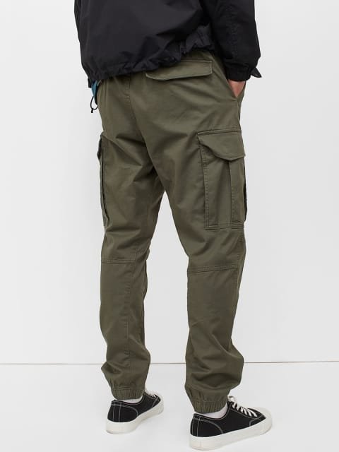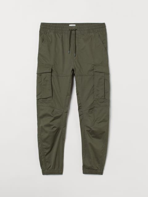Joggers in a cotton weave with covered elastication and a drawstring at the waist, diagonal side pockets and flap back and leg pockets with concealed press-studs. Tapered legs with seams and darts at the knees and covered elastication at the hems.
