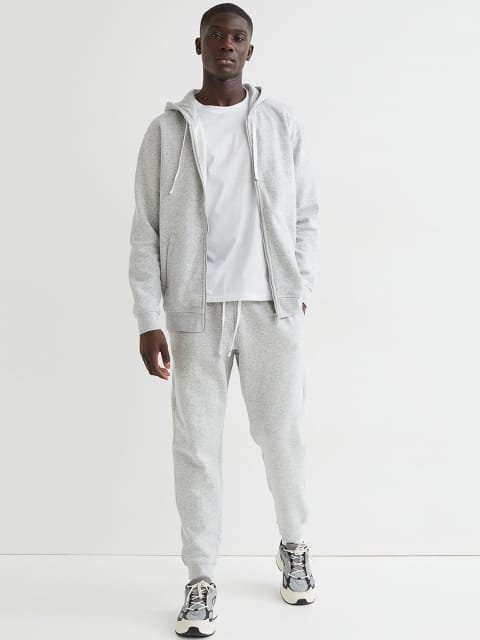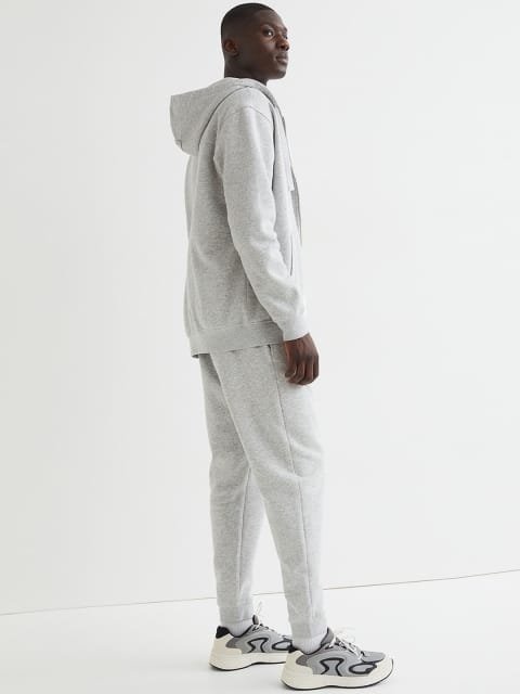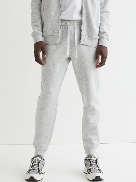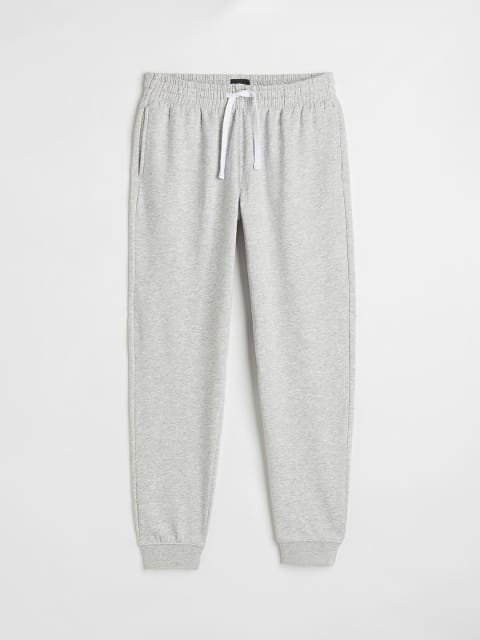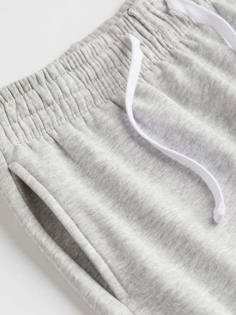 Joggers in sweatshirt fabric made from a cotton blend. Covered elastication and a drawstring at the waist, pockets in the side seams and ribbed hems. Soft brushed inside.