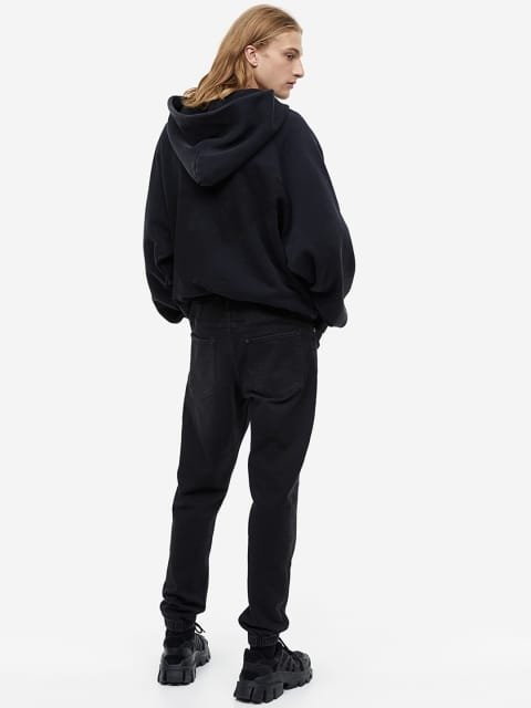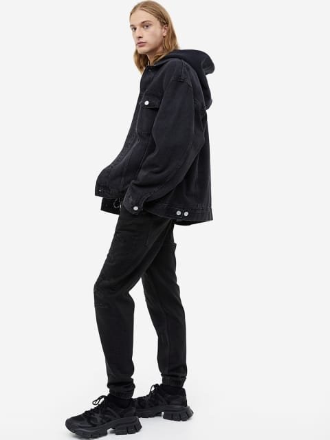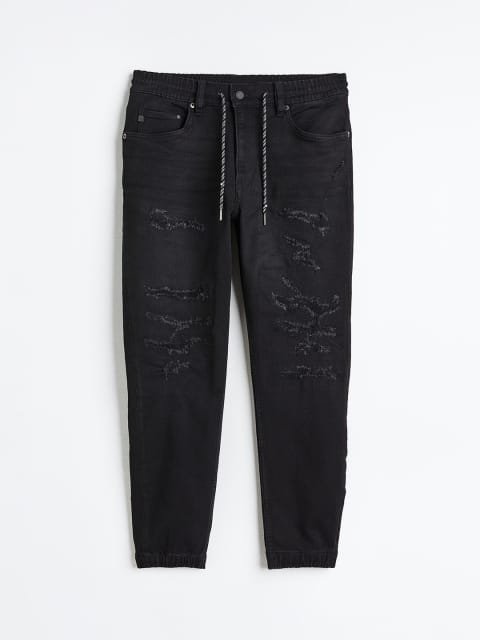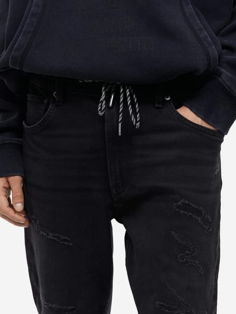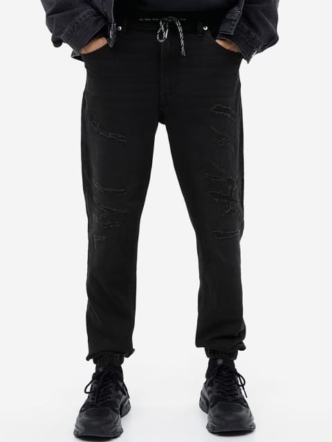 5-pocket joggers in soft, stretchy denim with hard-worn details. Regular waist with covered elastication and a drawstring, and a zip fly with a button. Gently tapered legs with good room for movement over the thighs and knees, and covered elastication at the hems. Made using Lycra Hybrid Technology for exceptional softness and comfort without compromising the authentic denim look.