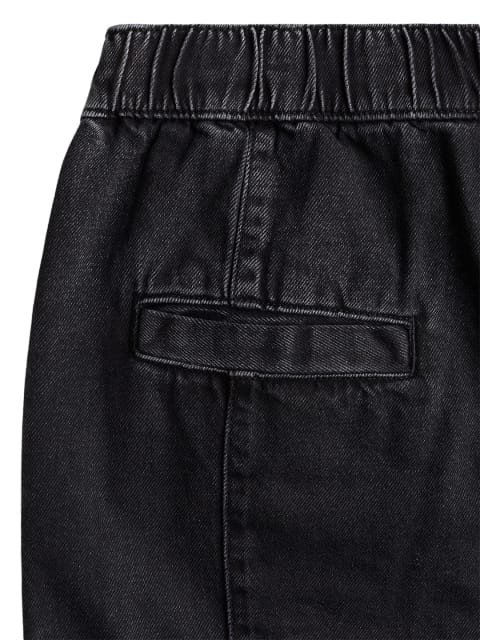 Cargo trousers in rigid cotton denim with covered elastication and a concealed drawstring at the waist and a fake fly. Side pockets, open leg pockets and welt back pockets. Covered drawstring at the hems. Loose fit for a generous but not oversized silhouette.