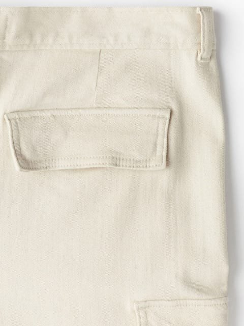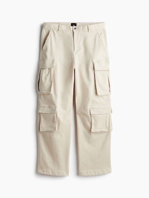 Cargo trousers in cotton twill with a zip fly and button, diagonal side pockets, flap pockets at the back and bellows leg pockets with press-studs. Loose fit for a generous but not oversized silhouette.