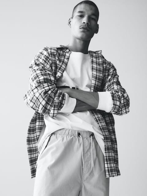 Parachute trousers in a cotton weave with a fake fly, covered elastication at the waist and a drawstring with cord stoppers at the front. Diagonal flap pockets with a press-stud at the sides and flap back pockets. Pleats at each side of the knees to create added width. Concealed drawstring at the hems. Loose fit for a generous but not oversized silhouette.