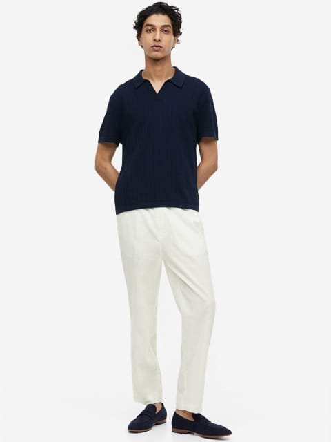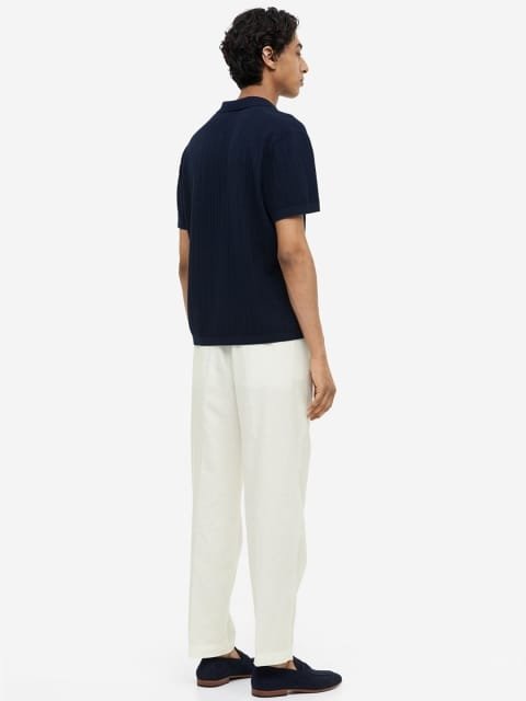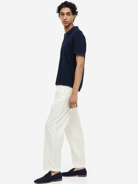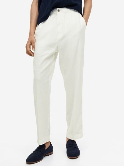 Trousers in an airy cotton and linen weave with covered elastication and a concealed drawstring at the waist. Regular fit with a zip fly and button, discreet side pockets and welt back pockets with a button. Cotton and linen blends combine the softness of cotton with the sturdiness of linen, creating a beautiful, textured fabric that is breathable and drapes perfectly.