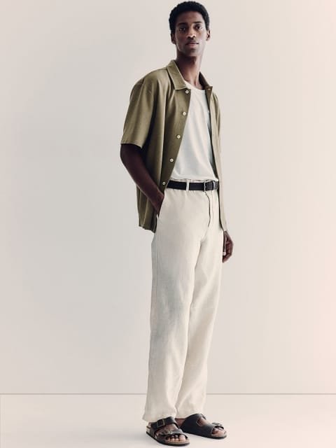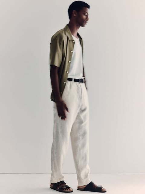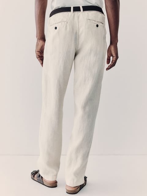 Trousers in airy linen with a zip fly and button and a concealed drawstring at the waist. Diagonal side pockets and welt back pockets with a button. Regular fit for comfortable wear and a classic silhouette. Fabric made from linen is breathable, beautiful both ironed and wrinkled, and softens over time.