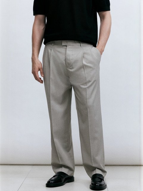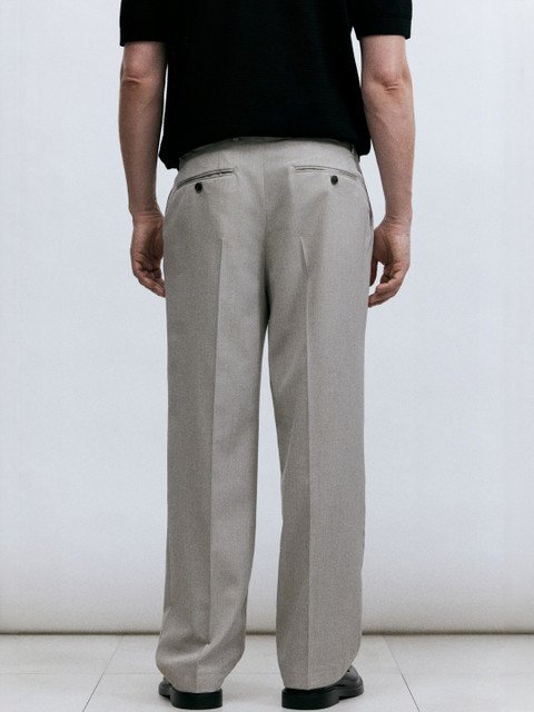 Suit trousers in a soft weave featuring a zip fly and an extended waistband with a concealed hook-and-bar fastener and a button. Side pockets, jetted back pockets with a button and creased legs with pleats at the top. Regular fit for comfortable wear and a classic silhouette.