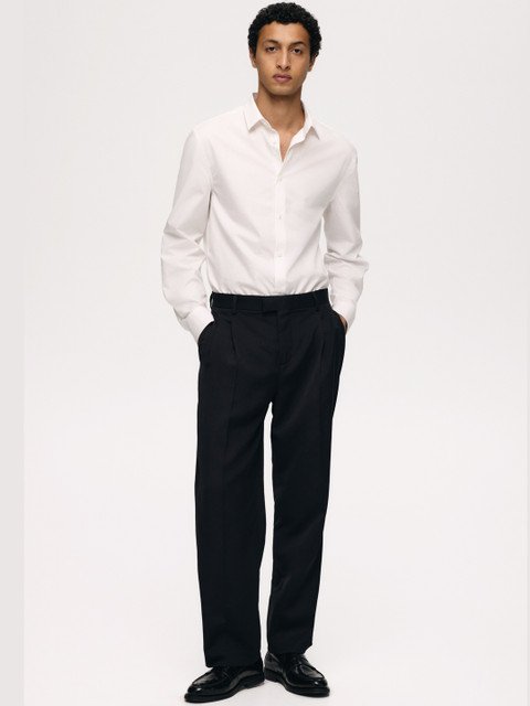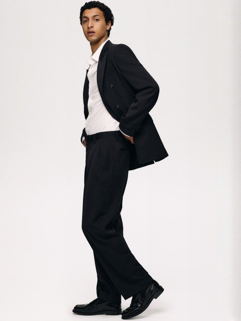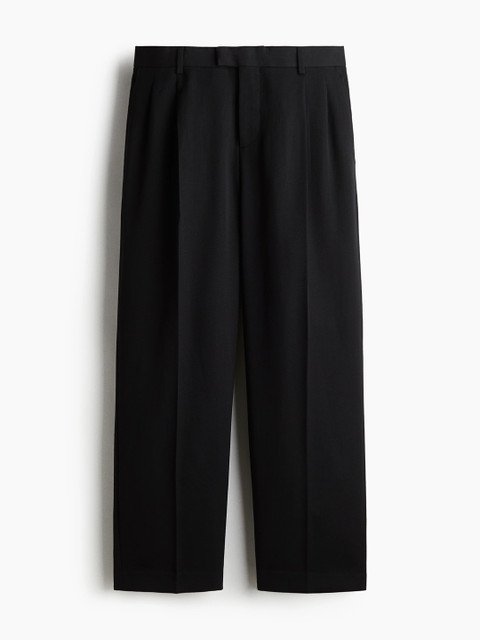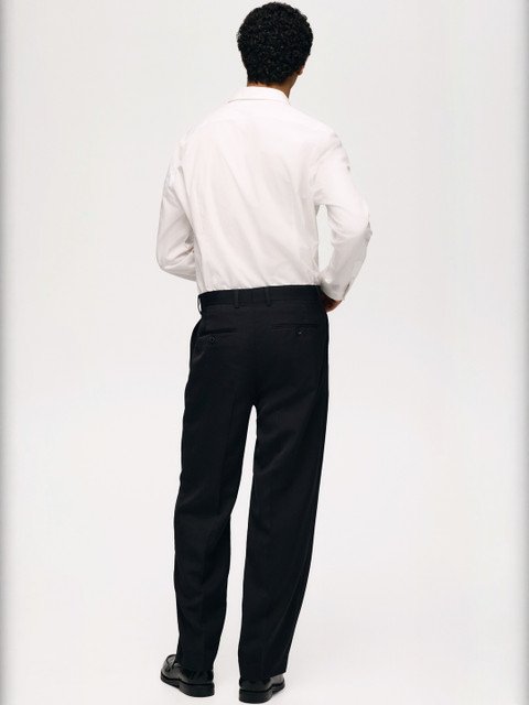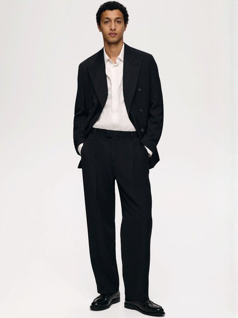 Suit trousers in a soft weave with a zip fly and an extended waistband with a concealed hook-and-bar fastener and a button. Side pockets, jetted back pockets with a button, and legs with pleats at the top and creases on the front and back. Relaxed fit for a casual but not oversized silhouette.
