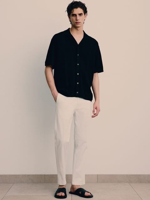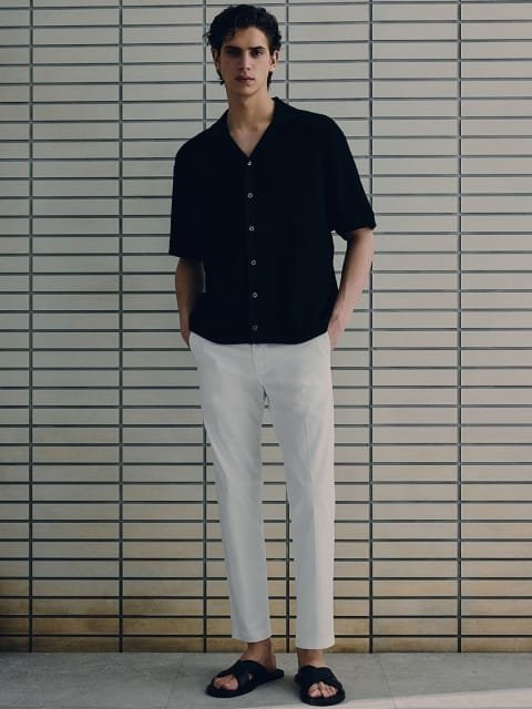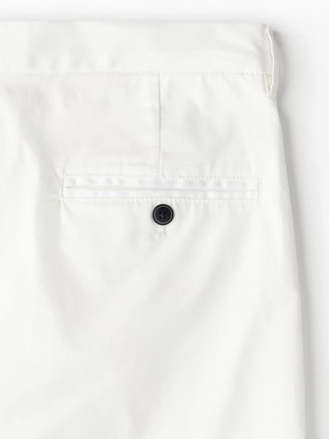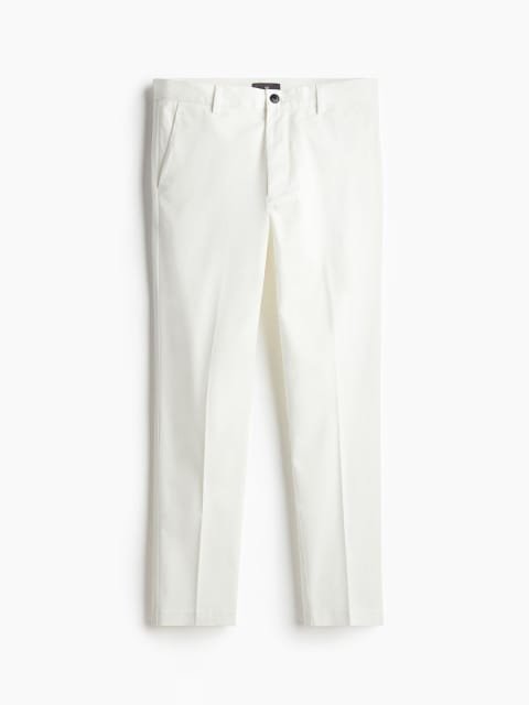 Ankle-length trousers in a soft cotton weave with a zip fly and button, diagonal side pockets, jetted back pockets with a button and creases on the front and back. Slim fit that hugs the contours of your body, creating a fitted silhouette.
