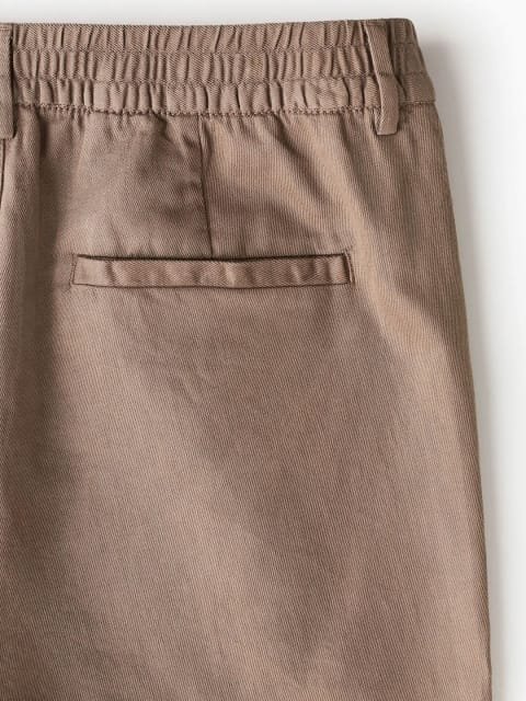 Trousers in an airy cotton and linen weave with covered elastication at the waist and a zip fly and button.