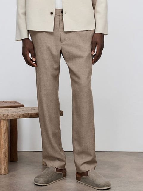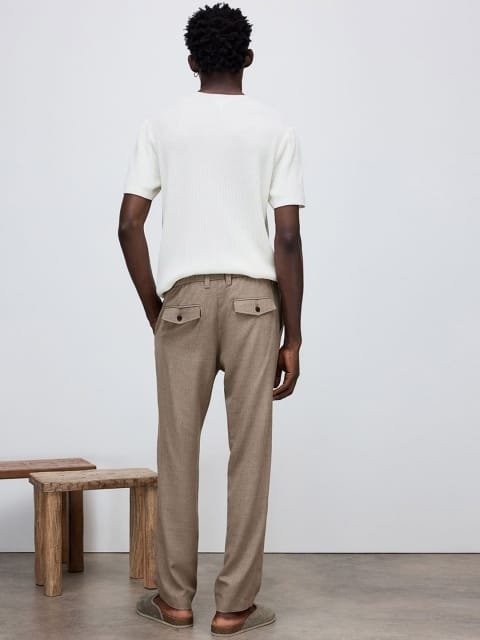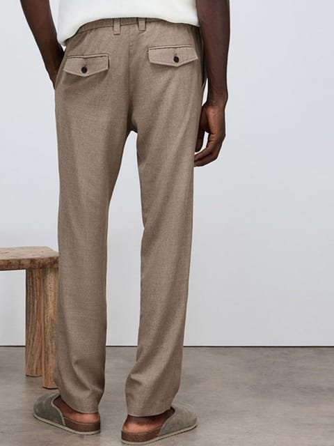 Trousers in twill with covered elastication at the waist and a zip fly and button. Diagonal side pockets, flap back pockets with a button, and straight legs. Regular fit for comfortable wear and a classic silhouette.