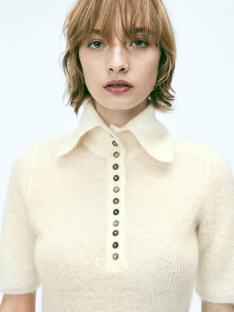 Fitted top in a sheer, fine rib knit containing wool and mohair. Collar, pearl buttons at the top, short sleeves and a straight hem.