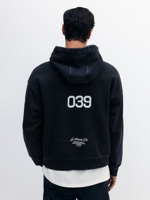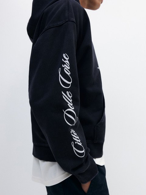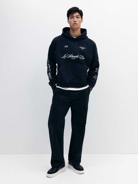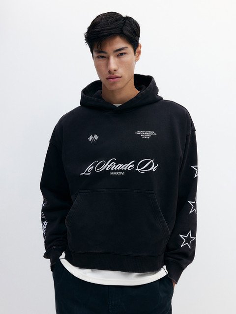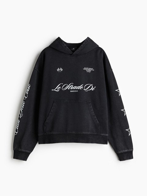 Hoodie in heavyweight cotton sweatshirt fabric with a washed look and a print motif. Dropped shoulders, long sleeves, a kangaroo pocket and wide ribbing at the cuffs and hem. Oversized fit for a baggy, extra-loose silhouette.