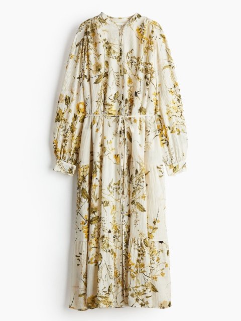 Ankle-length, oversized dress in an airy, crinkled weave with a small collar, buttons down the front and a narrow, detachable tie belt at the waist. Gently dropped shoulders and long balloon sleeves with narrow, buttoned cuffs. Gathered shoulder seams and a flared skirt with gathered tiers for added volume. Jersey underdress.