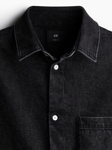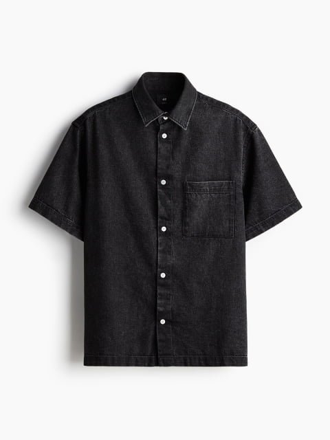Short-sleeved shirt in rigid cotton denim with a turn-down collar, classic front, yoke at the back and a straight-cut hem with a slit at each side. Loose fit for a generous but not oversized silhouette.