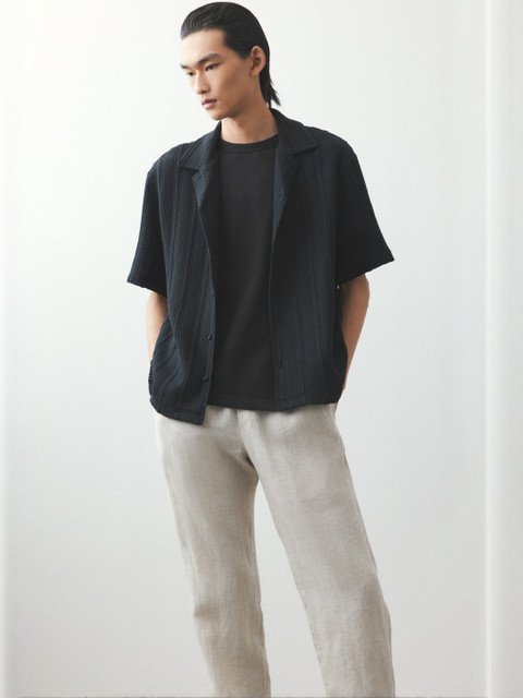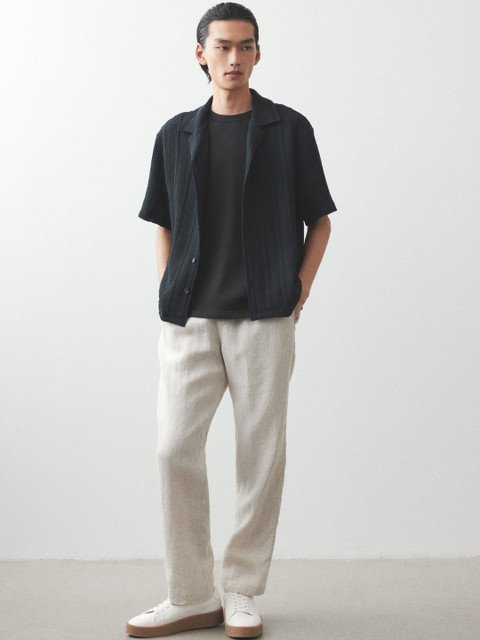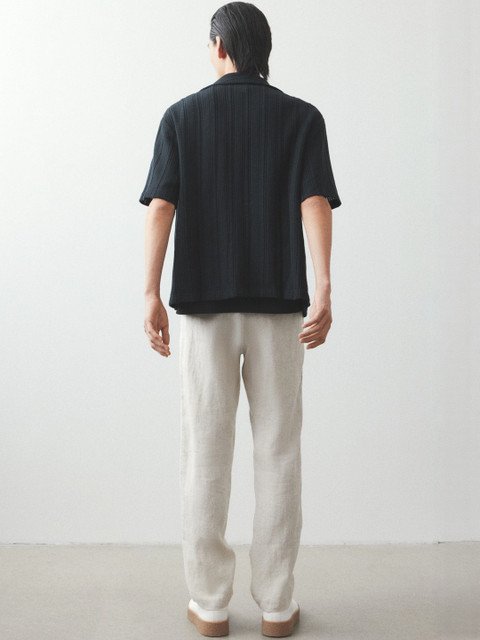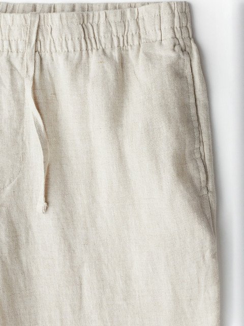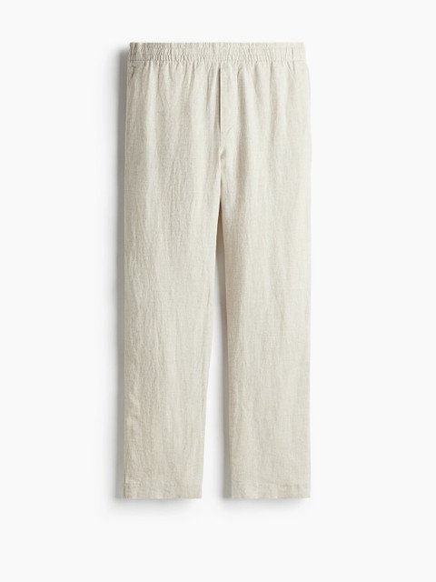 Trousers in airy linen with covered elastication and a concealed drawstring at the waist, a fake fly, discreet side pockets and a welt back pocket. Regular fit for comfortable wear and a classic silhouette. Fabric made from linen is breathable, beautiful both ironed and wrinkled, and softens over time.