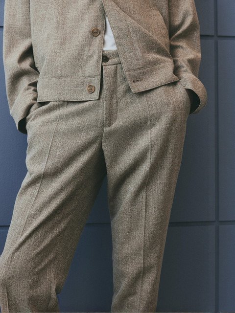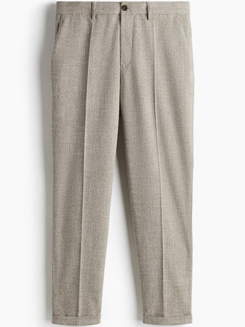 Tailored trousers in twill with a zip fly and button, diagonal side pockets, flap back pockets with a button and tapered legs with creases and turn-up hems. Regular fit for comfortable wear and a classic silhouette.