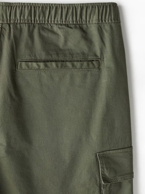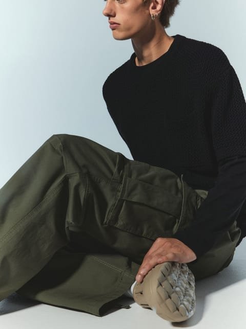Trousers in cotton twill with a fake fly and covered elastication and a drawstring at the waist. Diagonal side pockets, welt back pockets and bellows leg pockets with a flap and press-studs. Straight legs with sewn-in pleats at the knees and a drawstring at the hems. Relaxed fit for a casual but not oversized silhouette.