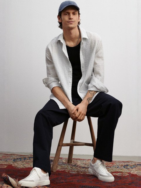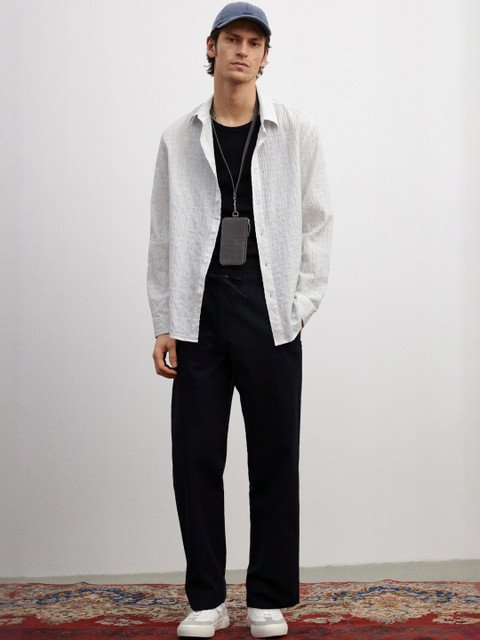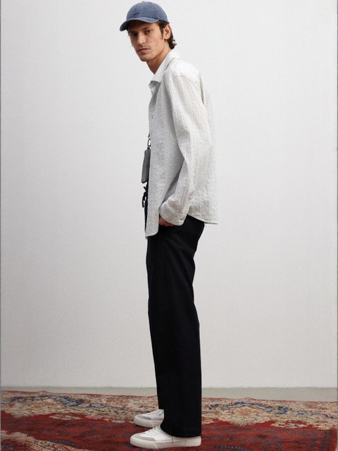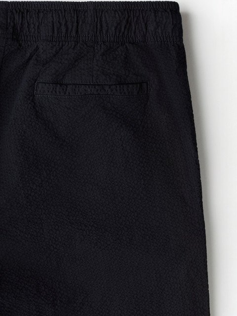 Trousers in cotton seersucker featuring an elasticated, drawstring waist, a zip fly with a button, pockets in the side seams and welt back pockets. Relaxed fit for a casual but not oversized silhouette.