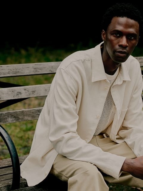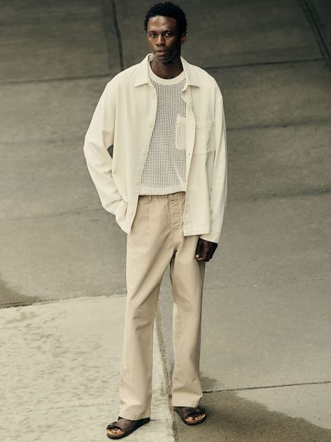 Trousers in cotton twill with an elasticated waist, pleats at the top and straight legs. Diagonal side pockets, an open back pocket and an open leg pocket. Relaxed fit for a casual but not oversized silhouette.