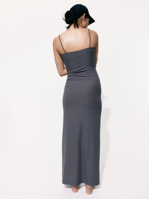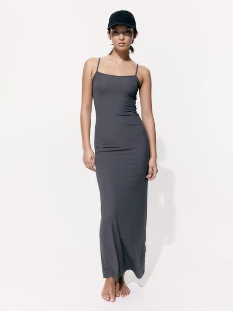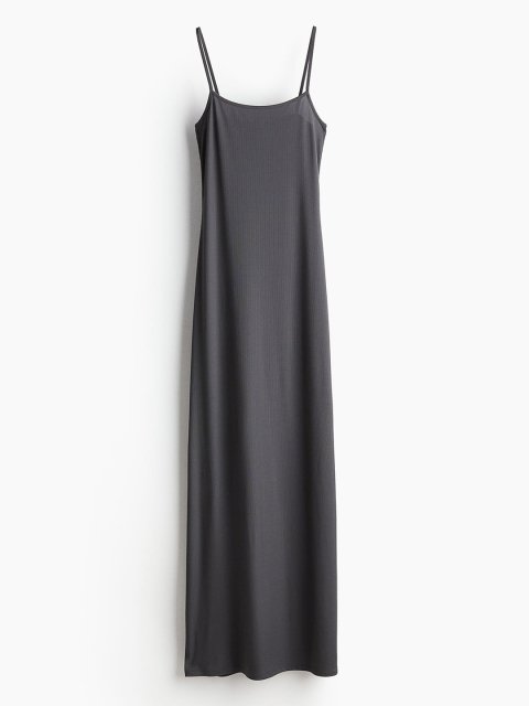 Long, fitted dress in ribbed jersey with a deep, round neckline, narrow shoulder straps and a straight-cut hem.