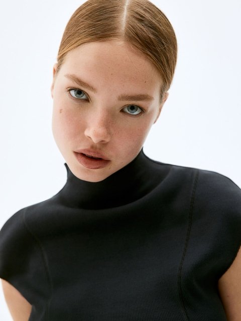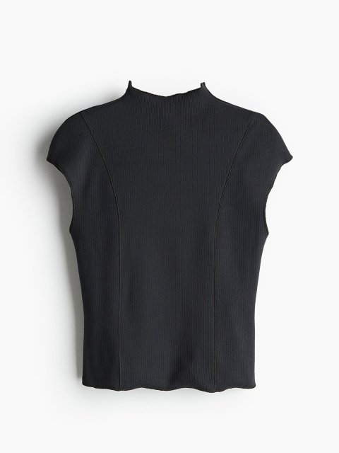 Short, fitted top in ribbed cotton jersey with decorative flatlock seams at the front. Turtle neck, cap sleeves and an overlocked hem.