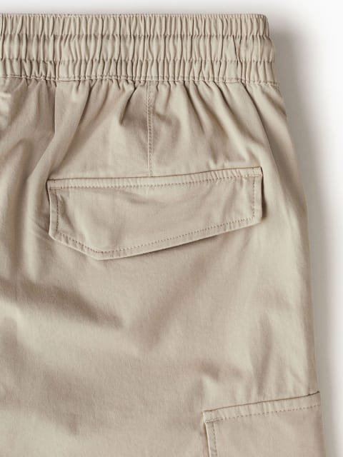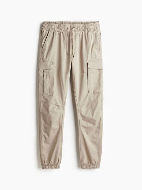 Joggers in a cotton weave with covered elastication and a drawstring at the waist, a fake fly, diagonal side pockets and flap back and leg pockets with concealed press-studs. Tapered legs with seams and darts at the knees and covered elastication at the hems.