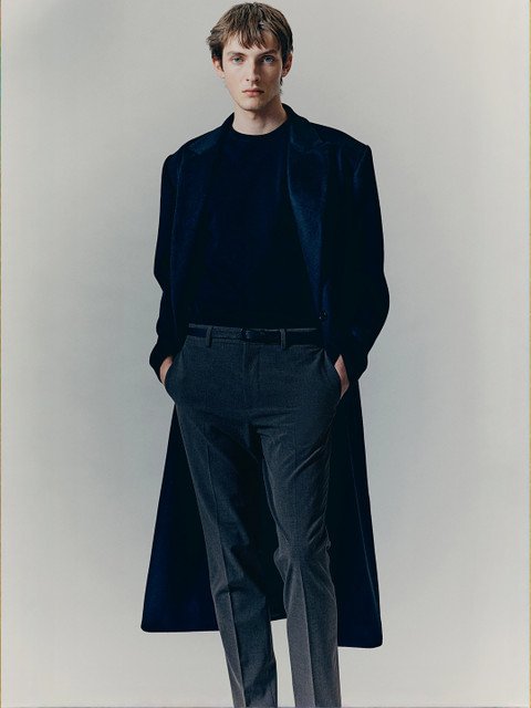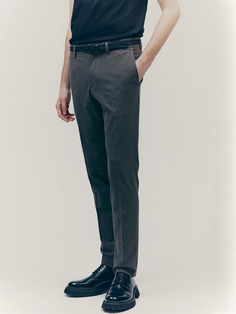 Tailored trousers in a soft weave with a zip fly and button, side pockets and jetted back pockets with a button. Legs with creases. Slim fit that hugs the contours of your body, creating a fitted silhouette.