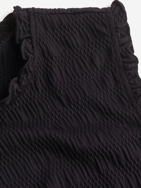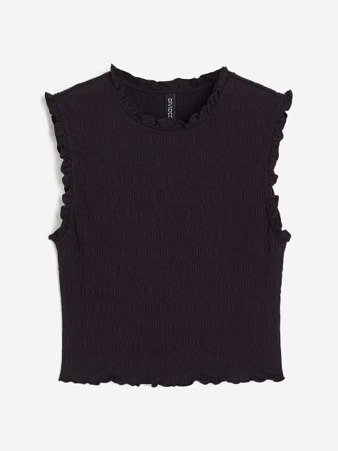 Short, fitted, smocked top in jersey. Sleeveless silhouette with a round neckline and small, overlock-edged frill trims around the neckline, armholes and hem.