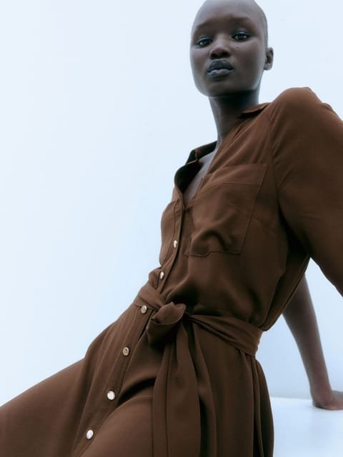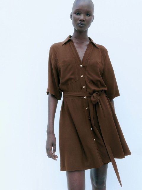 Short dress in woven fabric with a collar, V-shaped opening and buttons down the front. Elbow-length raglan sleeves, open chest pockets and a wide, detachable tie belt at the waist. Unlined.