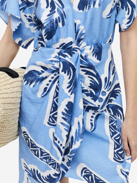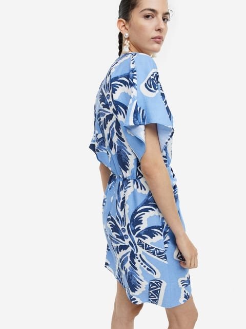 Short dress in woven fabric with a deep V-neck and a concealed hook-and-eye fastener at the front. Wide, elbow-length sleeves, an elasticated seam at the waist and a sewn-in wrapover skirt. Unlined.