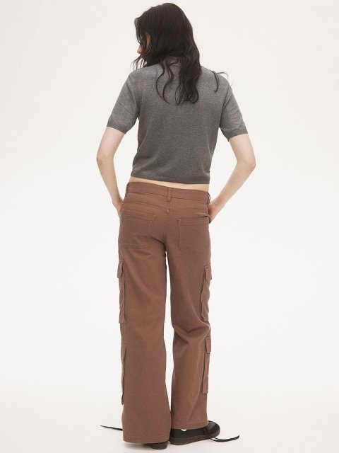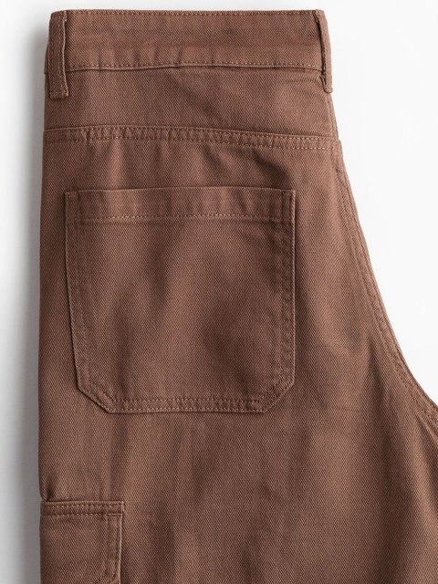 Trousers in cotton twill with a zip fly and button, diagonal side pockets and open back pockets. Wide legs with two flap bellows pockets each.